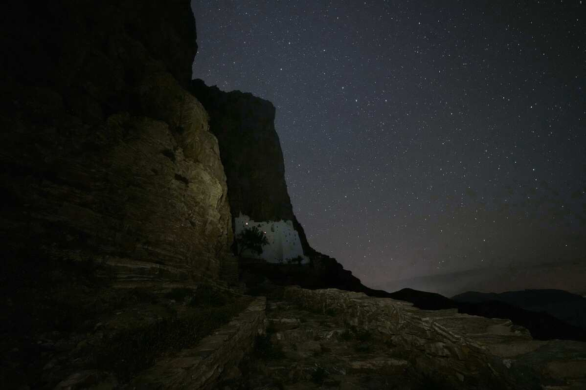 The tall, whitewashed complex is a speck about half-way up the precipitous mountain that plunges into the Aegean Sea. Except for a few small chapels scattered among the rocks, no other structure is in sight — and no light pollution to dim the swirl of stars as it increasingly does around the world.