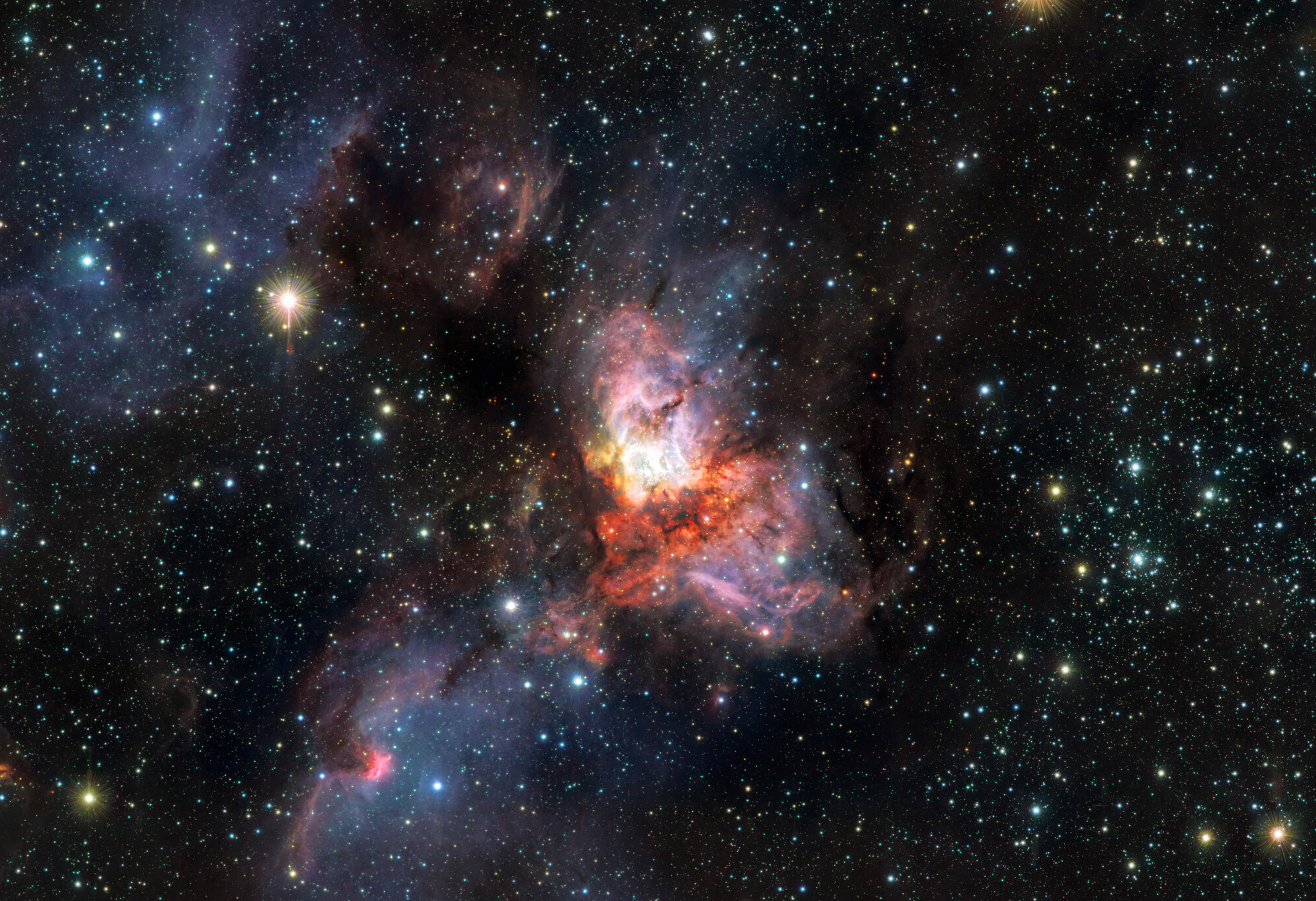 Meet the colourful extravaganza of the RCW 38 stellar nursery, located some 5500 light-years away from us, in the constellation Vela. With its bright streaks and swirls, this birthplace of stars is not afraid to flaunt its colours. From the vivid pink of gas clouds to the multi-coloured dots, which are young stars, this image has it all.
